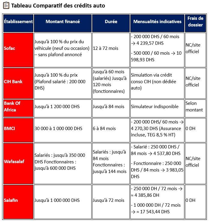 Vous avez trouvé la voiture idéale ? Ne laissez pas le financement gâcher l’affaire. Entre les banques et les sociétés de crédit au Maroc, les conditions de prêt varient du simple au double : taux d’intérêt, durée, frais, assurance… Notre comparateur vous aide à identifier les meilleures offres selon votre profil. Avant de signer, comparez. Une bonne décision aujourd’hui vous évite de payer plus chaque mois.